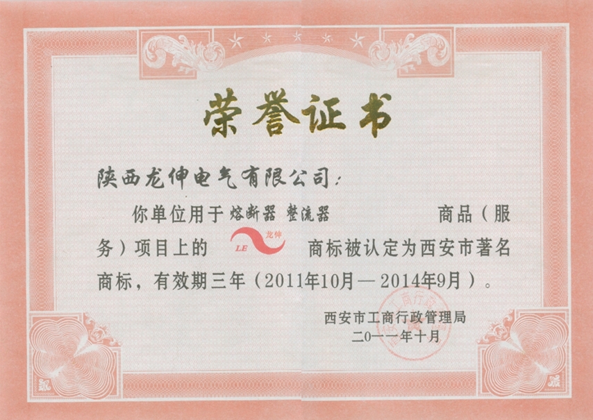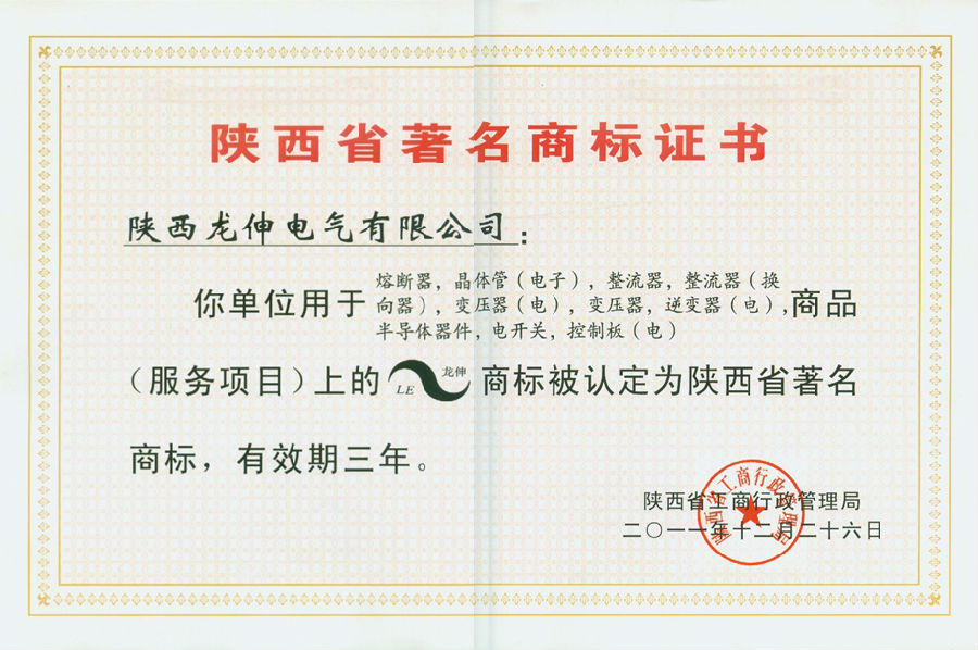 龙伸电气获得《西安市著名商标》和《陕西省著名商标》证书。