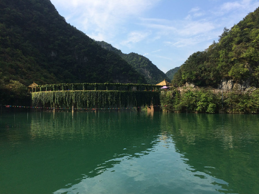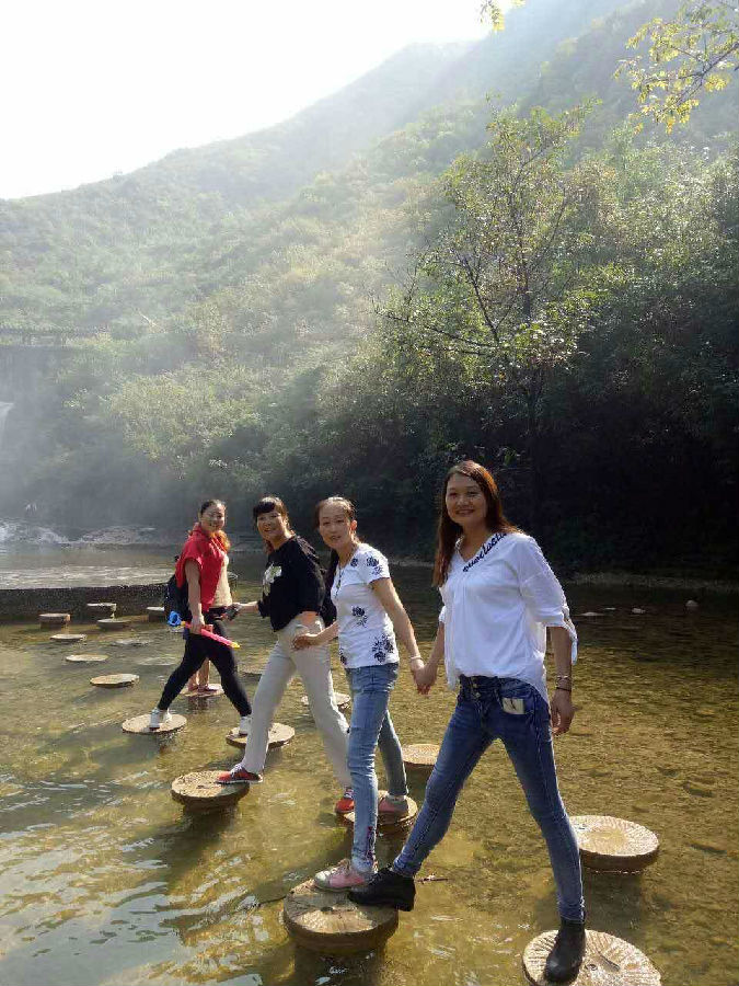 一束阳光照进房间,用过早餐,我们来到五龙河景区,大家在巨大的石门前合影留念,进入景区,我们停足凝视前方,映入眼帘的是一片翠绿,四周群山高低有错,郁郁葱葱,群山环抱的峡谷里,一条条弯曲的小溪,潺潺的流躺着,溪水清凉,清澈见底,还有不少成群的鱼儿在自由自在的畅游着,在两边的山上,绿色的植被在风中微微摇曳,并发出轻轻的沙沙声,像是欢迎我们的到来,我们走在山间蜿蜒的小道上,大家彼此用尖叫声传递着内心的喜悦,用手中的镜头留下彼此开心的笑容,山美,水美,人更美。山谷中清风徐徐,绿叶婆娑,仿佛低声絮语,诉说着最美的情话。来到五龙河瀑布跟前,只见银色的水流像老爷爷的白胡子,一缕一缕的倾泻下来。风吹过来,把水吹成轻雾洒在脸上,凉丝丝的,好像在洗刷自己的灵魂。大家互相帮助,携手走在摇晃的索桥上,相扶攀爬在上山的山道上。