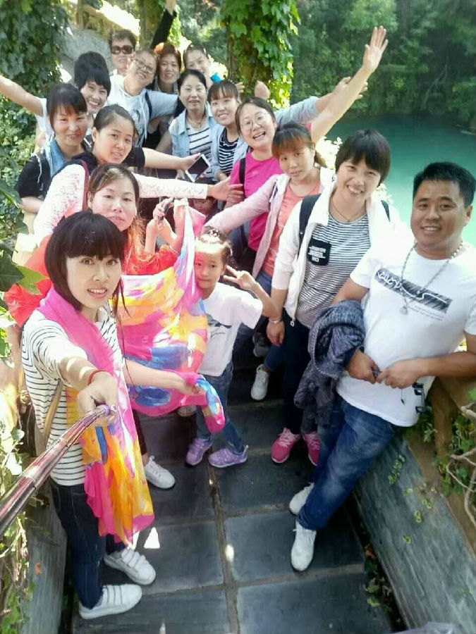 一束阳光照进房间,用过早餐,我们来到五龙河景区,大家在巨大的石门前合影留念,进入景区,我们停足凝视前方,映入眼帘的是一片翠绿,四周群山高低有错,郁郁葱葱,群山环抱的峡谷里,一条条弯曲的小溪,潺潺的流躺着,溪水清凉,清澈见底,还有不少成群的鱼儿在自由自在的畅游着,在两边的山上,绿色的植被在风中微微摇曳,并发出轻轻的沙沙声,像是欢迎我们的到来,我们走在山间蜿蜒的小道上,大家彼此用尖叫声传递着内心的喜悦,用手中的镜头留下彼此开心的笑容,山美,水美,人更美。山谷中清风徐徐,绿叶婆娑,仿佛低声絮语,诉说着最美的情话。来到五龙河瀑布跟前,只见银色的水流像老爷爷的白胡子,一缕一缕的倾泻下来。风吹过来,把水吹成轻雾洒在脸上,凉丝丝的,好像在洗刷自己的灵魂。大家互相帮助,携手走在摇晃的索桥上,相扶攀爬在上山的山道上。